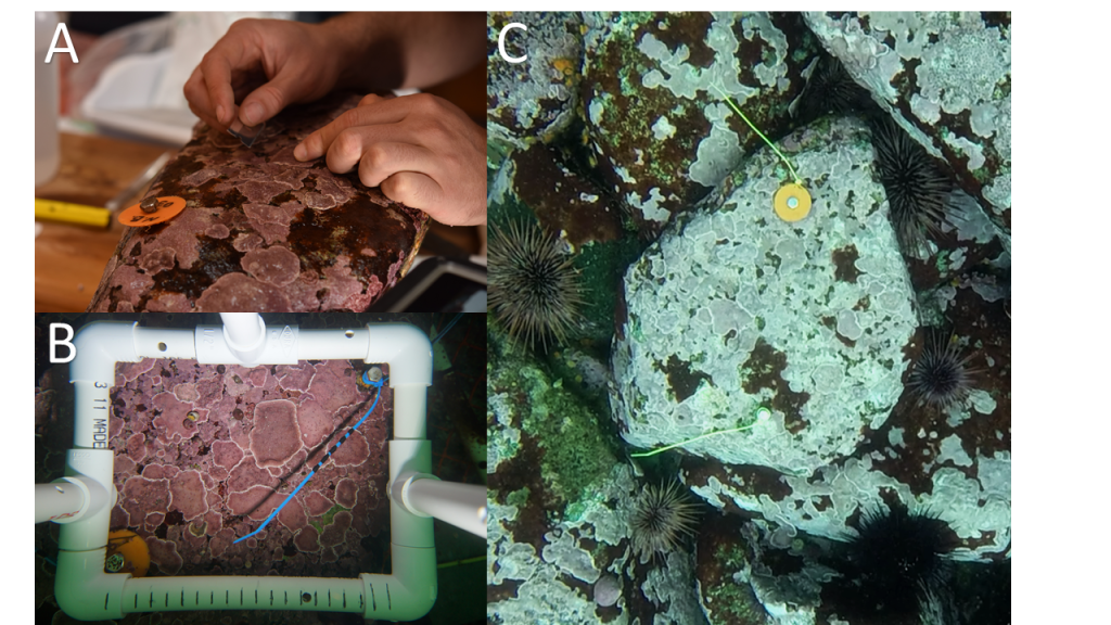 Coralline algae are a group of calcified red algae that form pink crusts across rock surfaces. These organisms provide ecosystem services in many nearshore marine environments by promoting settlement of many invertebrate larvae (e.g. abalone & urchins) and kelp species. Previous studies around Calvert Island, BC used DNA identification to quantify specifies diversity, discovering urchin barrens (devoid of kelp) to have lower coralline diversity than their kelp forest neighbours. Experiments are currently underway to examine the mechanisms of these differences in coralline communities and how these differences may affect the recovery from urchin barrens to healthy kelp forests.